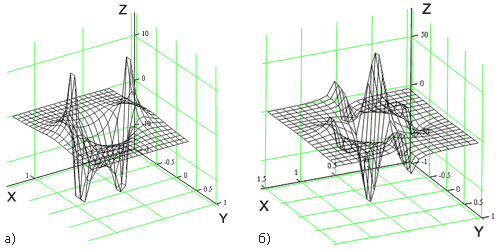 ': а) вычисленная для одноимённых зарядов по формуле (37) в пределах (–0,5 < x < 1,5; –1 < y < 1); б) вычисленная для разноимённых зарядов
