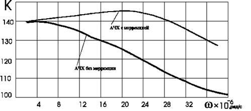 Рис 3. АЧХ каскада с коррекцией и без коррекции в диапазоне 105