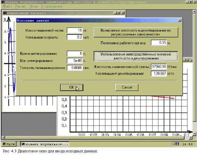 Для практического использования динамической модели при разработке технологических процессов, вычисления главных параметров – времени переходного процесса и оптимальной скорости позиционирования, используются выражения (2.33) и (3.19), которые были использованы при создании программы “Mrl” (см. рис. 4.4).