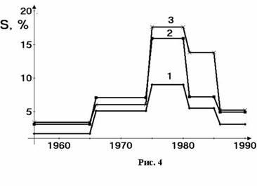 Катастрофическое изменение S (см. пик 2 рис.№1), вызвано ВОВ (1941 – 1945 гг.). В результате экономического регулирования правительства Советов S было понижено (менее 1.5 % в год) при беспрецедентном по длительности периоде стабильности с 1960 по 1980 г.г., что явилось, вероятно, рекордным процессом за всю многовековую историю России (см. рис. 1 и рис. 2, ветвь 1). Еще более уникальным является изменение S для ГДР (ветвь 3 на рис. 2), вероятно рекордная стабильность для всего мирового процесса того исторического периода. Из анализа рис.2 также допустимо сделать вывод о возможности обратного «фазового» кинетического перехода при конкретных исторических условиях (во многом специфических) из социалистической системы в капиталистическую без формальных катастрофических потерь в национальном масштабе. Хотя, по мнению аналитиков, развитие Германии будет длительное время тормозиться огромными затратами на продолжающиеся процессы объединения и выравнивания. Из совместного анализа рис.2 и рис. 3 можно предположить, что дестабилизация экономики стран, членов Совета экономической взаимопомощи (СЭВ), началась с восточно-европейских социалистических стран. При совместном рассмотрении рис. 2, 3, 4 можно установить взаимные влияния экономик представителей стратегических конкурирующих блоков мировой системы того исторического периода в Европе.