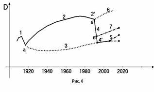 На рис. 6 виден ниспадающий участок ветви ССДС – 2I, предвестник крушения структуры ССДС, в которой к этому времени ослабилась когерентность поведения индивидуумов из-за понижения классового самосознания и снижения политической активности в «застойный» период. Сдача позиций в идеологической борьбе, ослабление которой в теоретическом плане, плане генерирования идей, заметил, например, П.Л. Капица еще в 1969г. [24]. П.Л. Капица предлагал поднять роль общественных наук в жизни общества, активнее полемизировать с философами на мировом уровне. П.Л. Капица подчеркивал изолированность в работе наших философов теоретиков, их неучастие в идеологической борьбе с учеными развитых капиталистических стран. Это и многое другое привело к пораженческим настроениям по отношению к реализации идей социализма в массовом сознании граждан. Документальные подробности этого периода работы ССДС наиболее полно изложены в источнике [25], включая силовое решение 3-4 октября 1993 года, ключевые моменты бифуркации системы по направлениям: президентская структура, Верховный совет. Вероятно, для полного понимания значимости событий 1991-1993г.г. полезно процитировать С.П. Курдюмова [9]. «В режиме с обострением характерные величины системы многократно, вплоть до бесконечности, возрастают за конечный промежуток времени» (см. рис. 1,2). «А ведь нелинейные системы достаточно быстро приводят именно к этому режиму, к степенным закономерностям, катастрофическому развалу системы, если воздействовать на неё грубой силой. А за этим стоит другой мир, другой тип аттрактора, странного аттрактора, для которого характерны «случайные блуждания» и который, по Пригожину, может быть так же назван «привлекающим хаосом»» [9].