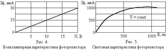 характеризующая зависимость фототока (при постоянном световом потоке Ф) или темнового тока от приложенного напряжения. Для фоторезисторов эта зависимость практически линейна (рис. 4 приложения). Закон Ома нарушается в большинстве случаев только при высоких напряжениях на фоторезисторе.