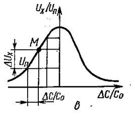 На Рис. 9 приведены измерительные цепи в виде параллельного (а) и последовательного (б) колебательных контуров, питаемых стабильным по амплитуде и частоте напряжением U , снимаемым с генератора Г. При изменении емкости C=C + C напряжение (Рис. 9, а) или ток (Рис. 9, б) в цепи резонансного контура будут меняться, достигая максимума при резонансе =l/ . На склонах, резонансной кривой (Рис. 9, в) мелено выбрать участок, близкий к линейному, в середине которого выбирается рабочая точка М, соответствующая среднему значению емкости C преобразователя. При изменении емкости на напряжение на выходе будет меняться на .