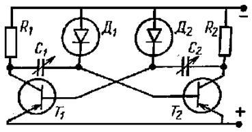 Емкостным преобразователь может быть элементом в схеме триггера. На Рис. 10 приведена схема мультивибратора, на выходе которого генерируется непрерывная последовательность импульсов.