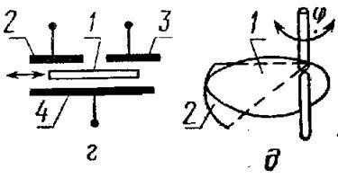 Рассматриваемая схема может быть использована в приборах уравновешивания. Для этого усиленный сигнал с конденсатора после фазочувствительного детектирования может быть подан на обкладки 1 и 2, вследствие чего на средний электрод будет действовать электростатическая сила, уравновешивающая измеряемую силу. На Рис. 11, г и д показаны схемы устройства емкостных преобразователей с переменной площадью. В схеме на Рис. 11, г диэлектрик 1 перемещается по стрелке, а в схеме на Рис. 11, д один из электродов 2 жестко связан с валом и совершает угловые перемещения относительно неподвижного электрода 1.