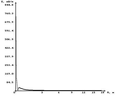 , мВ/м от расстояния R, км, построен на рис. 10. Как мы видим, с увеличением расстояния от ретранслятора напряженность поля убывает. На графике максимальное расстояние 18 км.