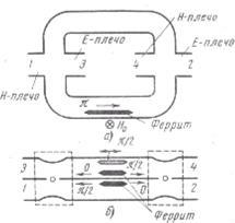 Выберем такую длину ферритовой пластины, при которой разность фазовых сдвигов в “прямом” и “обратном” направлениях составляет ровно π. Такой четырёхполюсник иногда называют гиратором. Тогда при подаче сигнала на вход 1 схемы, изображённой на рис. 2,а (т. е. в Н- плечо двойного тройника), две волны, приходящие во второй тройник и являющиеся первоначально синфазными, оказываются в противофазе ввиду сдвига на π в гираторе. С учётом свойств тройниковых разветвлений передача энергии в этом случае возможна только в Е- плечо, обозначенное цифрой 2. Таким образом, вся мощность, поданная на вход 1, поступает без потерь и отражения в плечо 2.