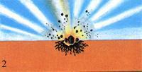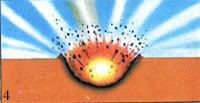 На первый взгляд эти понятия идентичны, но это не так. Метеорит - часть космического тела, который, пройдя атмосферу Земли, падает на ее поверхность. Метеор ("падающая звезда") - явление сгорания метеорного тела в верхних слоях атмосферы. При падении на Землю часть метеорита сгорает в атмосфере (рис. 1). Столкнувшись с земной корой, метеорит разрушает верхний каменный слой (рис. 2). Метеорит мгновенно испаряется, вызывая сильный взрыв (рис. 3). В результате взрыва в почве образуется глубокий круглый кратер (рис. 4).