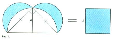 Надежды «квадратурщиков» подогревались существованием криволинейных фигур, квадрируемых циркулем и линейкой. Гиппократ Хиосский нашёл одну из таких фигур, известную как «луночки Гиппократа» (рис. 6). Он нашёл и другие луночки, допускающие квадратуру, что, конечно, не помогло ему решить саму исходную задачу. Заметим, что вопрос о том, какие луночки квадрируемы, оказался сложным и был полностью решён только в XX в., советским математиком Н. Г. Чеботарёвым.