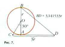 Было предложено множество построений. В лучшем случае они давали приближённое значение p с достаточно хорошей точностью (см., например, рис. 7). Однако, в отличие от приведённых выше решений двух других знаменитых задач, эти построения были принципиально приближёнными. Впрочем, авторы таких построений часто не сомневались в их абсолютной точности и горячо отстаивали свои заблуждения. Один из самых громких споров на эту тему произошёл в Англии между двумя выдающимися учёными XVII в. — философом Томасом Гоббсом и математиком Джоном Валлисом. В весьма почтенном возрасте Гоббс опубликовал около десяти «решений» задачи о квадратуре круга.