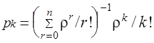 Обозначим число каналов, занятых в момент . Тогда можно показать, что: если , во-первых, моменты поступления вызовов образуют пуассоновский поток однородных событий, во-вторых, длительности разговоров последовательных абонентов суть независимые (между собой и от моментов поступления вызовов) одинаково распределенные случайные величины, то случайный процесс , обладает эргодичным распределением, т.е. существуют [независящие от начального распределения ] пределы