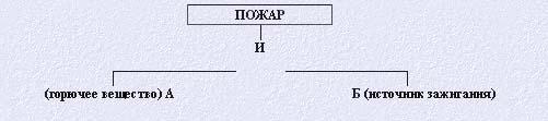 Пожар произойдёт, если одновременно произойдут два события (логическая операция И) - появится горючее вещество и источник зажигания.