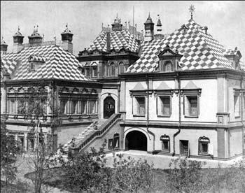 Эту городскую усадьбу пожаловал князю Г. А. Юсупову император Петр II в 1727 году. В 1891 году ее владельцы - княгиня З. Н. Юсупова и князь Ф. Ф. Юсупов - задумали реставрацию фасадов и создание новых интерьеров парадных помещений второго этажа, расположенных в восточной части ансамбля: большой палаты, кабинета князя, столовой и приемной. Как уже говорилось, интерьеры должны были быть выдержаны в стиле XVII - начала XVIII столетия - программном стиле царствования Александра III. Лучшим знатоком этого стиля считался Н. В. Султанов. Император, к сожалению, умер до окончания работ. Хозяева и зодчий «очень горевали, что (...) истинно «русский» царь не видел единственного «настоящего русского» дома в Москве!»4