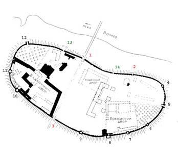 План кремля на рубеже XVII - XVIII в. (По Н.Н. Кузьмина, Л.А. Филиппова. Крепостные сооружения Новгорода Великого. СПб, 1997 г., рис. 9. )