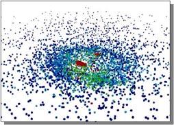 Рис. 7 – После образования двух горячих зародышей (красные пятна), значительная часть более холодного (зеленый и синий цвет) материала исходного облака частиц остается в окружающем пространстве (размеры частиц увеличены).