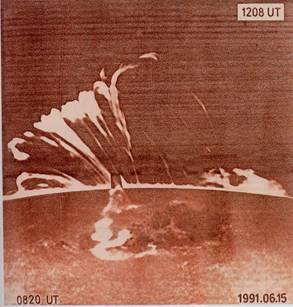 Рис.1 Солнечная вспышка 15 июня 1991г. Светлые пятна над поверхностью светила - выброс его вещества. Петлеобразные структуры - вспышечная плазма в магнитном поле.