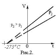 Графически зависимость объема от температуры изображается прямой линией – изобарой (рис. 2). При очень низких температурах (близких к – 273°С) закон Гей–Люссака не выполняется, поэтому сплошная линия на графике заменена пунктиром.