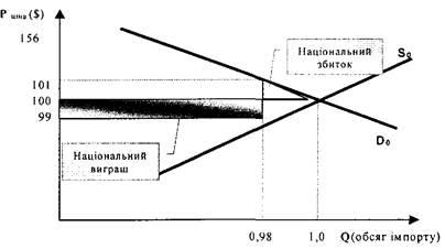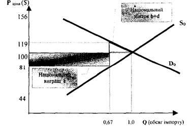 Отже, для світового господарства митний тариф залишається непривабливим. Світова економіка втратила сегменти в; d; /, які могли б бути перевагою, отриманою від міжнародної торгівлі, оскільки споживачі в країні А оцінюють іноземний товар X при обсягах імпорту в межах 1 млн. одиниць на рік вище, ніж витрати виробництва іноземних постачальників.