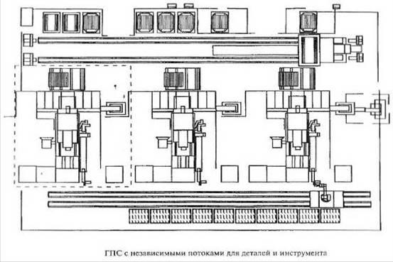 Более сложную структуру имеет ГПС в тех случаях, когда наряду с транспортным потоком деталей имеется еще и транспортный поток инструмента. Существует немало способов практической реализации такой структуры. Например, транспортирование деталей может осуществляться с помощью каретки свободной адресации, а доставка инструментальных наладок выполняется рельсовой тележкой, на которой смонтирован робот, играющий роль приемопередающего механизма.