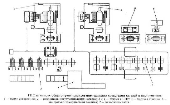 Для каждого изделия при заданных требованиях к количеству и качеству продукции могут быть разработаны различные варианты ГПС, отличающиеся методами и маршрутами обработки, контроля и сборки, степенью дифференциации и концентрации операций технологического процесса, типами транспортно – загрузочных систем, числом обслуживающих транспортных средств (ОТС), характером межагрегатных и межучастковых связей, конструктивными решениями основных и вспомогательных механизмов и устройств, принципами построения системы управления.