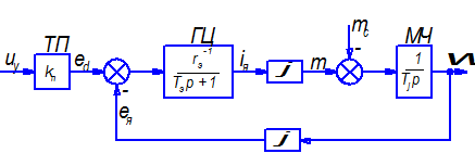 При синтезе регулятора скорости считаем, что момент статического сопротивления равен нулю (режим идеального холостого хода двигателя). При условии mC=0 объект управления в контуре скорости представляется одним звеном: