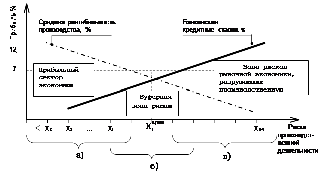 Рис. 1. Политэкономические варианты устойчивого развития несырьевого сектора производства в зависимости от предпринимательских рисков (12% - планово-расчётная норма прибыли, 7% - общероссийская средняя норма прибыли, фактически сложившаяся на период реформаторских преобразований): а) условия эффективности «рыночной» экономики; б) пространство «планово-рыночных» механизмов управления; в) зона рисков «программно-целевых» методов управления