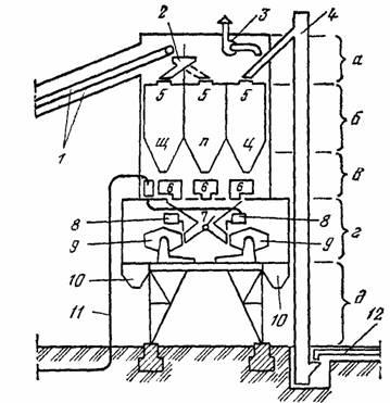 а - надбункерное помещение; б – расходные бункеры; в – дозаторное отделение; г – бетоносмесительное отделение; д – отделение выдачи готовой смеси; 1- наклонная галерея с ленточным транспортером; 2 – поворотная распределительная воронка; 3 – система вентиляции; 4 – вертикальный ковшовый элеватор для цемента; 5 – расходные бункеры щебня, песка, цемента; 6 – дозаторы; 7 – бункер-воронка с течками; 8 – дозаторы для воды; 9 – бетоносмесители; 10 – бункеры готовой смеси; 11 – подвод воды; 12 – горизонтальный шнековый транспортер для цемента.