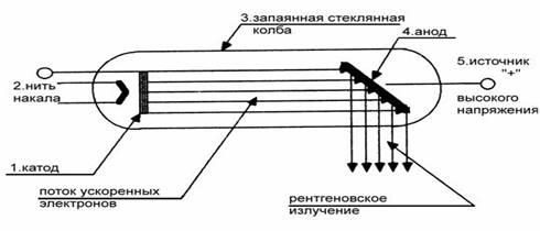 На Рис. 2 схематично представлены основные узлы рентгеновской трубки: катод (1) нить накала (2), стеклянная или керамическая колба (3), анод (4) и источник высокого напряжения (5). Получение рентгеновского излучения осуществляется путём бомбардировки анода трубки пучком электронов, ускоренных приложенным к её электродам напряжением. Источником электронов является катод с нитью накала из вольфрамовой проволоки, который нагревается до высокой температуры (примерно 2500°С).