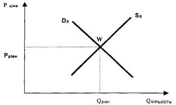 На рис. їй відповідає точка перетину кривих пропозиції і попиту, яка називається точкою рівноваги.