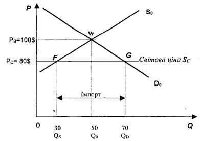 Включення країни до світової системи господарювання зумовлює появу на національному ринку товарів іноземного виробництва, тобто країна починає імпортувати певний товар, оскільки його ціна на світовому ринку Р нижча, ніж ціна рівноваги на внутрішньому ринку Рв