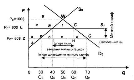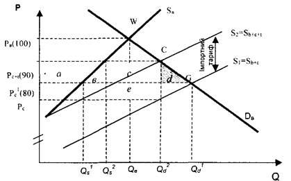 Після введення митного тарифу на ринку встановлюється нова рівновага, якій на графіку відповідає т.С. Наслідком цього стане збільшення національного виробництва з QJ до Сд.2