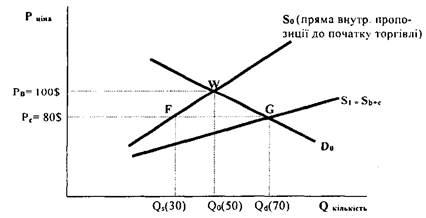 У даній ситуації вплив конкуренції іноземних товарів спрогнозувати — неважко. Внутрішня ціна на товари 100 дол. зменшиться до рівня світової ціни Рг