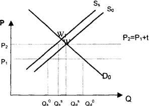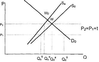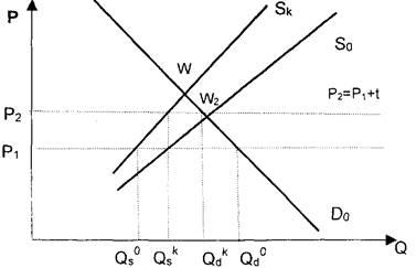У результаті зміщення кривої пропозиції ринкова рівновага встановиться в новій точці W. Тобто споживачі будуть сплачувати більшу ціну за імпортний товар, маючи при цьому меншу кількість імпортних товарів для вибору. Втрати іноземного постачальника товару залежатимуть від зменшення кількості реалізованих товарів на даному ринку і будуть визначатись зміною кількості зQ_d доQ'd.
