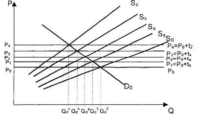 Так, при застосуванні специфічного мита відбувається незначне зміщення кривої позиції,що свідчить про зменшення національного ринку споживання до розміру. Використання ж адвалерного мита зумовлює значне зміщення кривої пропозиції вгору, тобто ринок споживання зменшується на величину. Зміщення кривої пропозиції при використанні комбінованого та змішаного мита вздовж кривої попиту вверх змінює положення точки рівноваги, що свідчить про значне скорочення ввезення товарів до країни, яке, у свою чергу, скорочує національний ринок споживання з товарної групи, відносно якої застосовуються дані види мита.