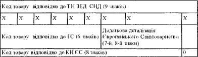 Вивчаючи проблеми, пов'язані з введенням у нашій країні ТН ЗЕД, насамперед, необхідно враховувати, що ця номенклатура побудована на основі та відповідно до ГС і КН ЄС. Довжина кодового позначення товару, що застосовується в ТН ЗЕД складає 9 цифрових знаків: розряди 1-6 відповідають кодовому позначенню, прийнятому в НГС, розряди 7-8 відповідають кодам КН ЄС, а 9-й розряд призначений для виділення в номенклатурі традиційних товарів.