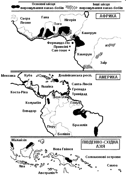 На рисунку 1.1 показані основні місця вирощування какао-бобів.
