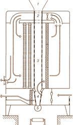 Какао-боби попередньо нагрівають, жарять і повністю прохолоджують конвекцією: 1 – приймальний бункер; 2 – стадія попереднього нагрівання; 3 – стадія обсмаження; 4 – стадія охолодження; 5 – забірний механізм