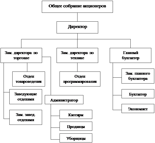 Высшим органом управления универмага «Крыница» является: общее собрание участников, наблюдательный совет, директор, которые рассматривают отчеты по деятельности, устанавливают размер дивидендов, решают другие наиболее важные вопросы. Организационная схема управления универмага «Крыница» приведена на рисунке 2.1.