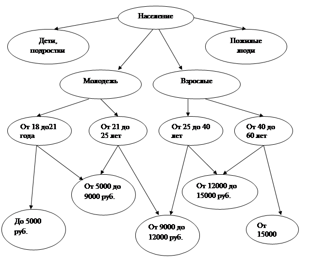 Итак, выделим сегменты рынка по алкогольной продукции ОАО «ВИЗИТ» по двум признакам: возрасту и уровню доходов (см. Схема 2)