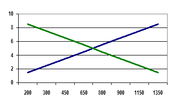 Пусть вначале продавцы запросили цену 8,5 р. за 1 кг картофеля. При этой цене величина предложения превысит величину спроса. Это означает, что будет продано только 200 кг из 1350, предлагаемых на рынке. Продавцам придется понизить цены, чтобы повысить величину спроса на свой товар. При этом часть продавцов покинет рынок, потому что издержки для них превысят цену.