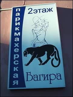 Большинство представительниц прекрасного пола хотят обладать качествами, которые олицетворяет образ пантеры. Один из путей достижения желаемого – это посещение салонов красоты, массажных кабинетов, и в том числе парикмахерских. В данном случае парикмахерская так и называется «Багира». На вывеске соседствуют пантера и женщина. Их изображения находятся в контрасте друг с другом: пантера нарисована чёрным глубоким цветом, а женщина обозначена лишь лёгкими, но очень завлекающими штрихами. Я считаю, что «плюсом»