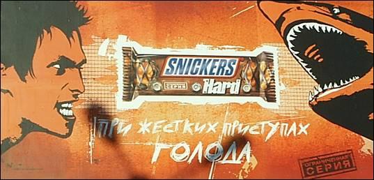 Новый «Сникерс» называется Hard, т.е. «жесткий, твердый». Такое название он получил из-за повышенного содержания орехов. Здесь человек сравнивается с хищником: в данном случае с акулой (есть ещё аналогичная реклама с волком). На плакате человек даже противопоставляется акуле, он конкурирует с ней за право обладать «Сникерсом». Слоган на плакате подтверждает визуальную информацию: При жестких приступах голода.
