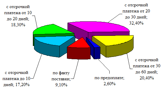Данные о поставках товаров в ОАО «ЦУМ Минск» в зависимости от условий оплаты приведены на рисунках 5 - 6.