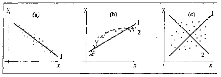 • на графике (с) явная взаимосвязь между переменными х и у отсутствует; какую бы мы ни выбрали формулу связи, результаты ее параметризации будут здесь неудачными. В частности, прямые линии 1 и 2, проведенные через "центр" "облака" точек наблюдений и имеющие противоположный наклон, одинаково плохи для того, чтобы делать выводы об ожидаемых значениях переменной у по значениям переменной х.