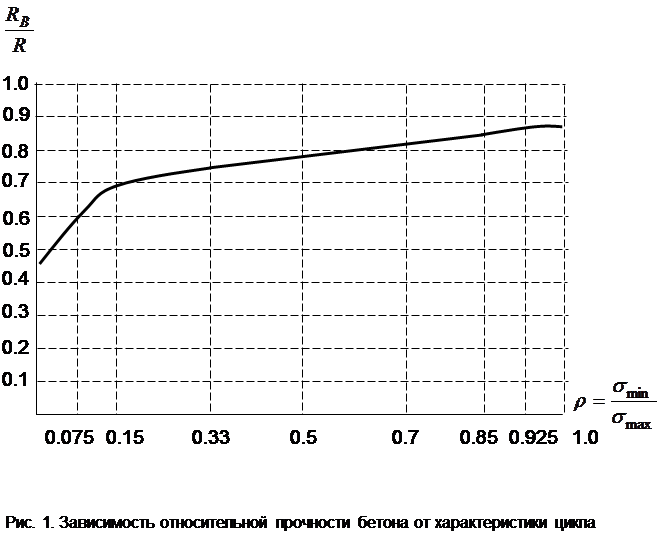 Такие испытания могут производиться как на натурных объектах, так и на моделях с использованием теории моделирования. Рассмотрим одну задачу – влияние многократно повторяющихся нагрузок на прочность материала. При действии таких нагрузок с числом повторений за время эксплуатации конструкции в несколько миллионов раз предел прочности материала в зависимости от характеристики цикла уменьшается. На рисунке 1 изображена кривая зависимости для бетона от характеристики цикла .Экспериментально установлено, что предел выносливости бетона может снизиться до в зависимости от вида напряжённого состояния. Величина необходима для расчёта конструкций при действии многократно повторяющейся нагрузки.