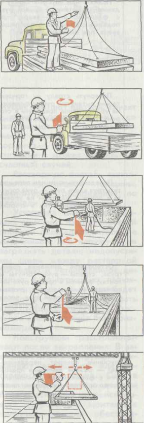 Переконавшись в надійності стропування, він відходить у безпечну зону і дає команду підняти панель. Машиніст крана плавно піднімає плиту.
