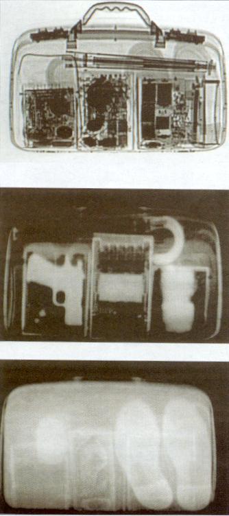 К третьему типу рентгеновских систем контроля относятся устройства, в которых в качестве основного или дополнительного каналов получения информации об объекте контроля используется альбедное излучение. Системы контроля такого типа могут быть одноканальными, т.е. использующими в качестве информационного только альбедное излучение, и двухканальными. В двухканальных системах информацию об объекте контроля получают путем комбинации результатов обследования альбедного на основе традиционного ("теневого") метода и нового - на основе обратнорассеянного излучения. Такое сочетание обеспечивает получение максимального эффекта при контроле широкой номенклатуры объектов. Следует отметить, что, несмотря на то, что такие системы представляют собой весьма сложные компьютеризированные устройства, время контроля единичного объекта составляет десятые секунды, а дозовые нагрузки на объект контроля сравнимы с уровнем естественного фона. В прил.1 в качестве примера приведены рентгенотелевизионные изображения ручной клади, полученные традиционным ("теневым") методом (а) и на основе альбедного излучения (б) и (в).