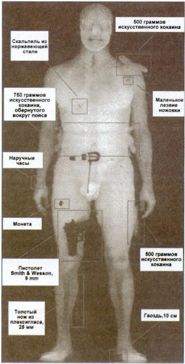 В прил.2 в качестве примера приведен результат контроля человека на установке третьего типа. Рентгенотелевизионное изображение человека с размещенными на теле (под одеждой) различными запрещенными для провоза предметами