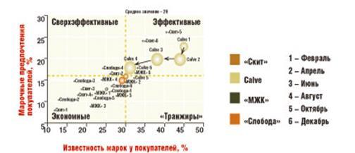 Как видим, марки-лидеры в зависимости от времени проведения исследования попадают либо в категорию "экономных", либо в категорию эффективных, тогда как категории сверхэффективных и марок-"транжир" остаются свободными (рис.2).