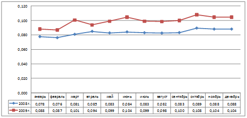 В 2009 г. сезонность реализации услуг ООО «Самитекс» увеличилась, т.к. увеличилось значение показателя «размах вариации» с 0,076 до 0,108, что негативно сказалось на деятельности предприятия. Эти изменения следует учесть при разработке комплекса мер по увеличению объема реализации услуг ООО «Самитекс» на проектируемый период.